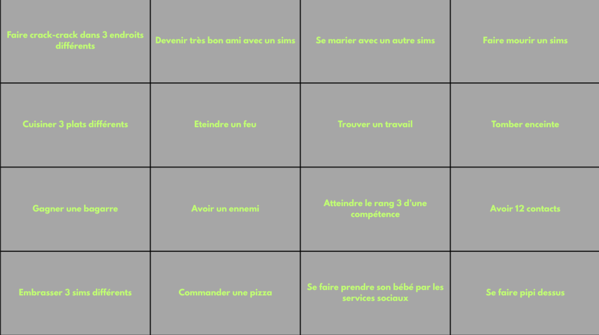 Format bingo : 1 point par case + 1 point par ligne / colonne / diagonale ( 20 points maximum)